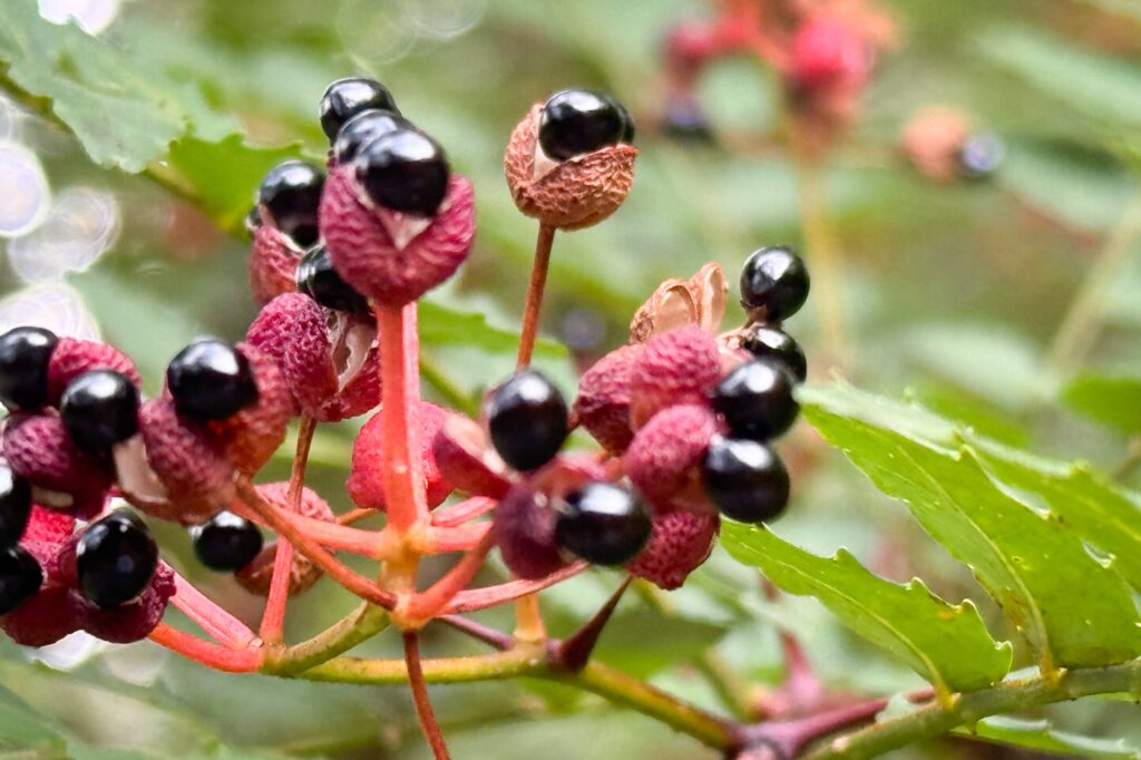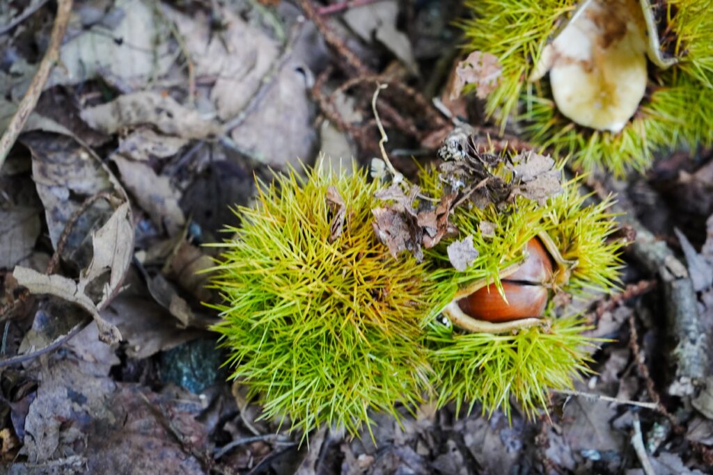 森では栗やどんぐりなど木の実が落ち、山椒は赤く色づき割れはじめました。