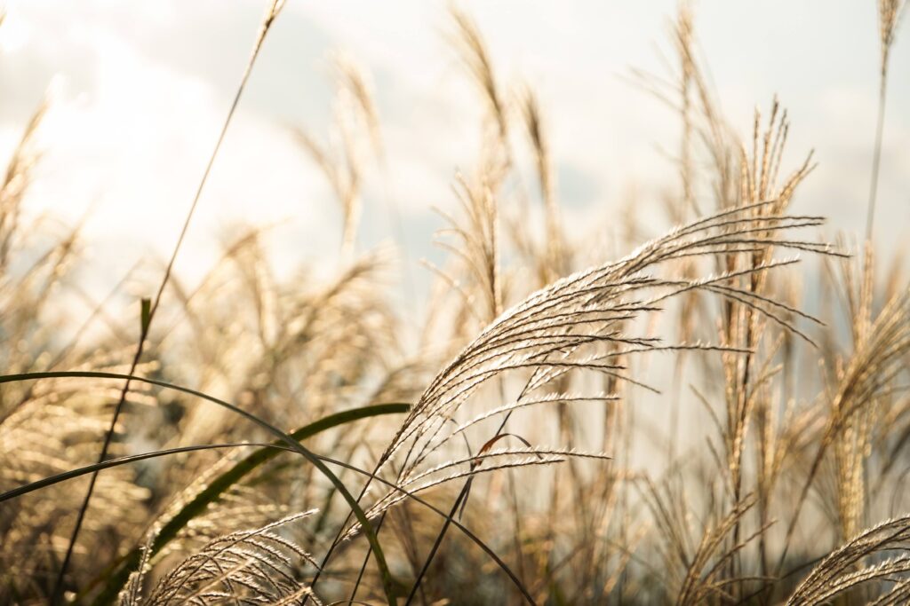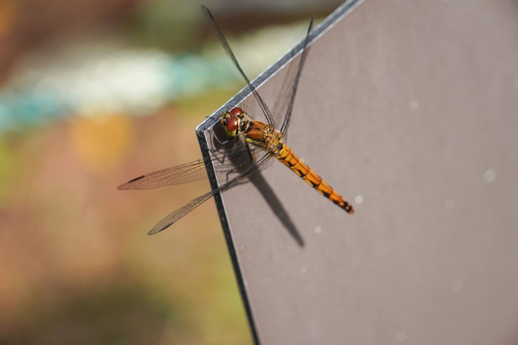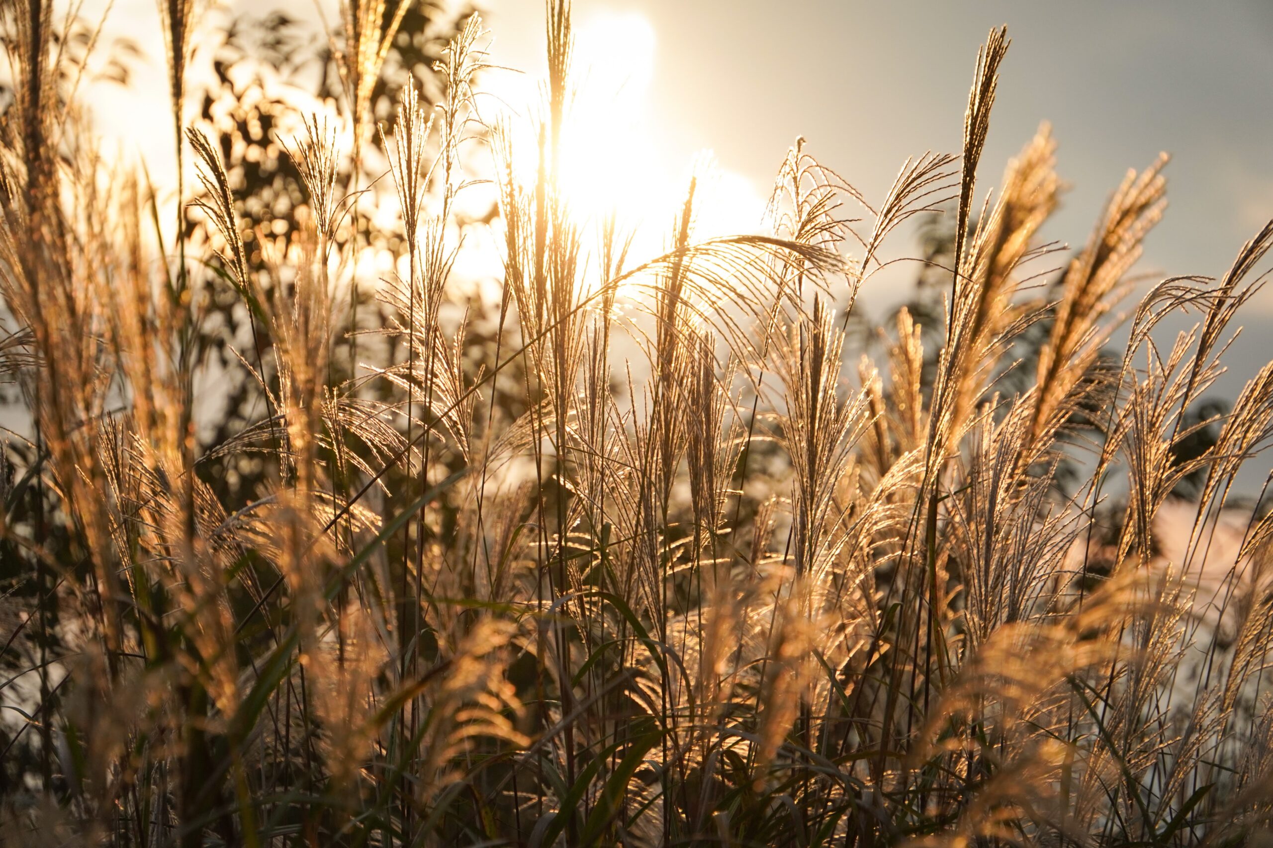 湖畔ではトンボが飛び、ススキは西日を浴びて金色に輝きます。