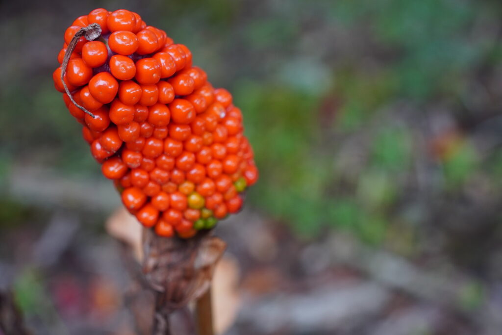 今の時期は森のあちこちでマムシグサが赤いトウモロコシのような実をつけています。熟すと赤い実をつける植物は他にも多く見られます。この赤色は、人によっては「美味しそう」と感じる一方、「危険信号」として捉える人もいるのではないでしょうか。信号の停止に赤色を使うのもここから来ているのかもしれません。