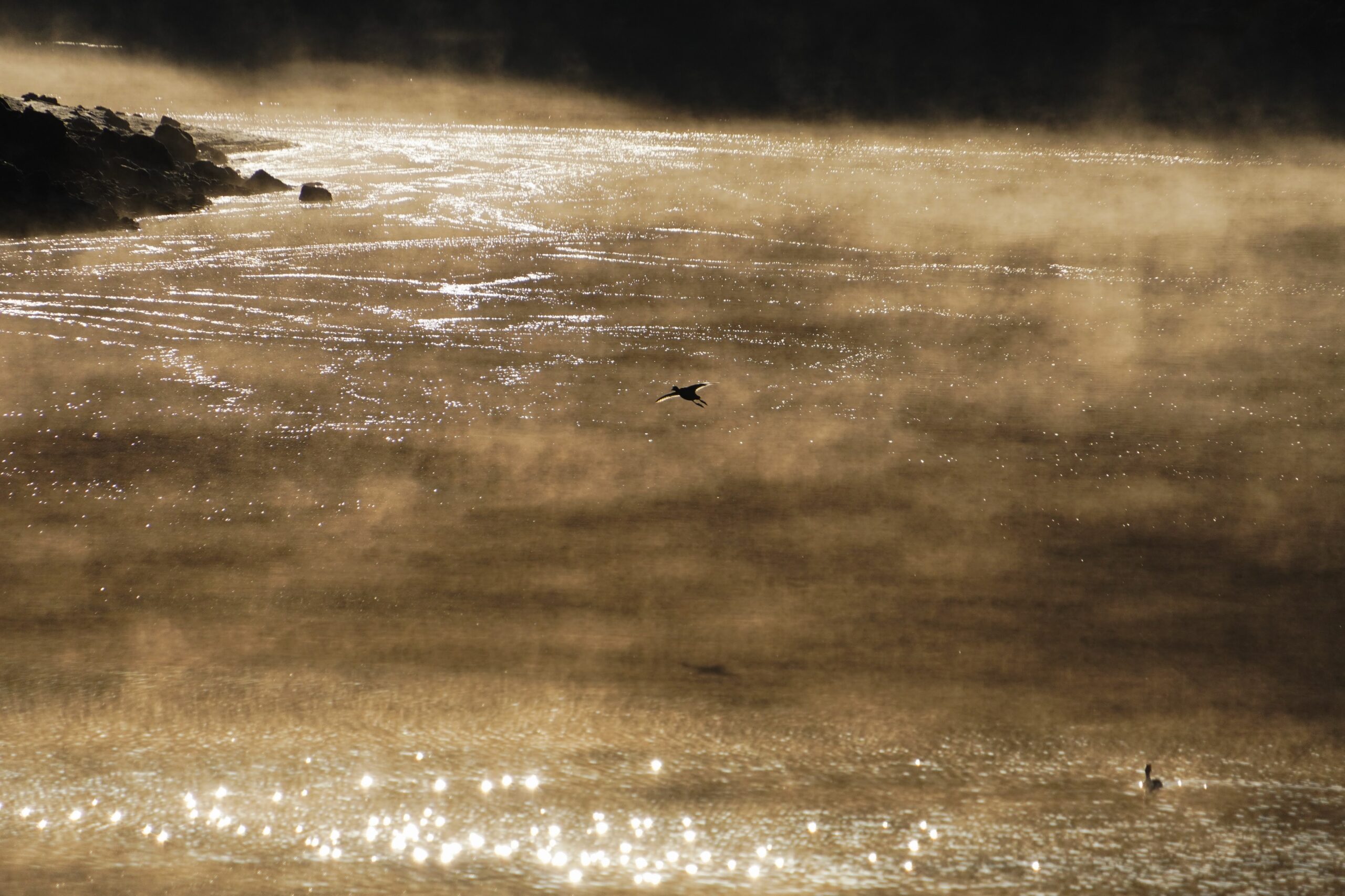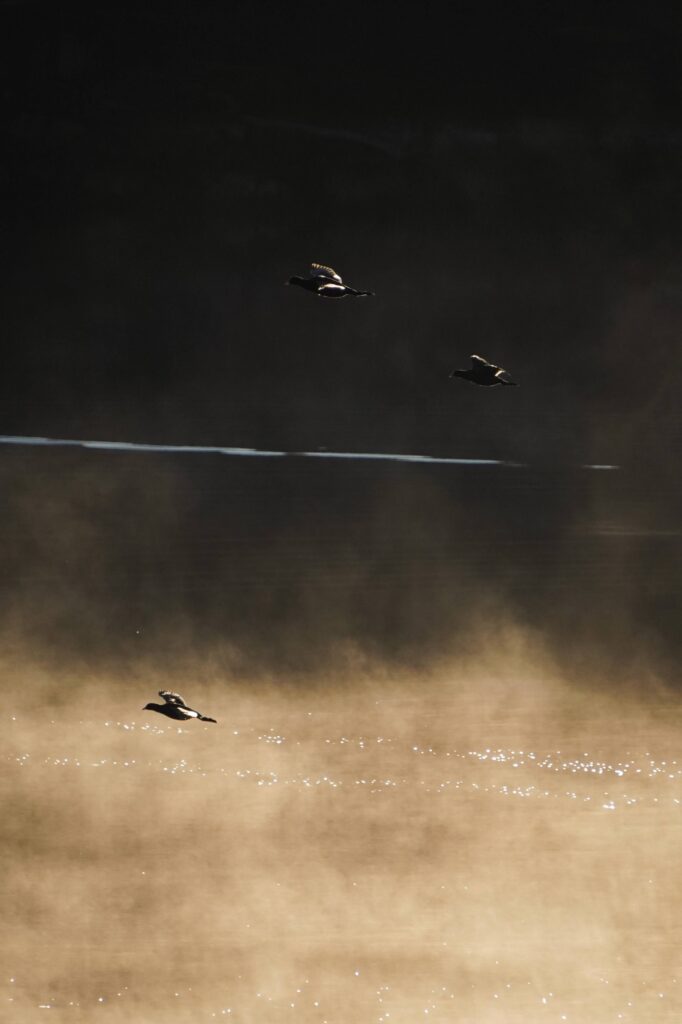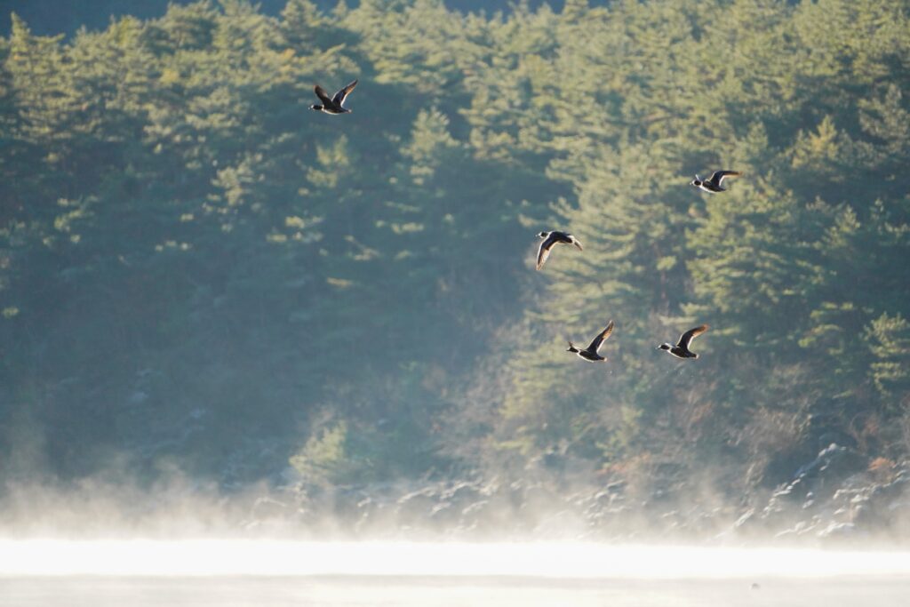 蒸気霧に包まれた湖では、シベリアから越冬のためにやってきた水鳥たちが、元気に飛び回ったり、水に潜ったりして暮らしています。