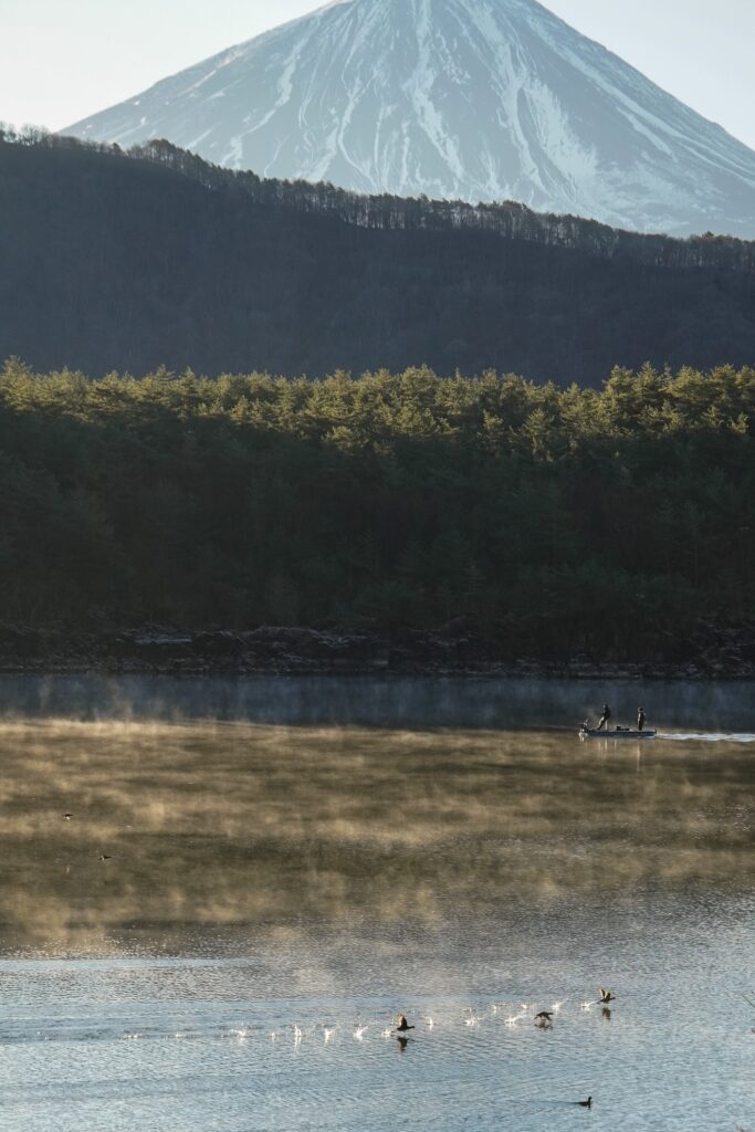 西湖の気嵐を見たい方は天気予報で朝7時から8時くらいの気温と風速、あとは西湖漁協のWEBサイトに水温が載っていますので、こちらもチェックすると良いと思います。