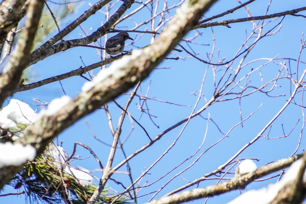 枝に残った雪もみるみる溶けて、雫となって滴り落ちてきます。