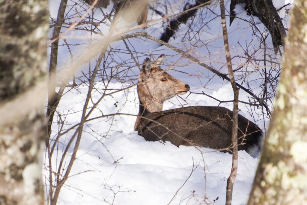 鹿たちも動き始めました。深く積もった雪に足をとられ、跳ねるようにして移動していきます。